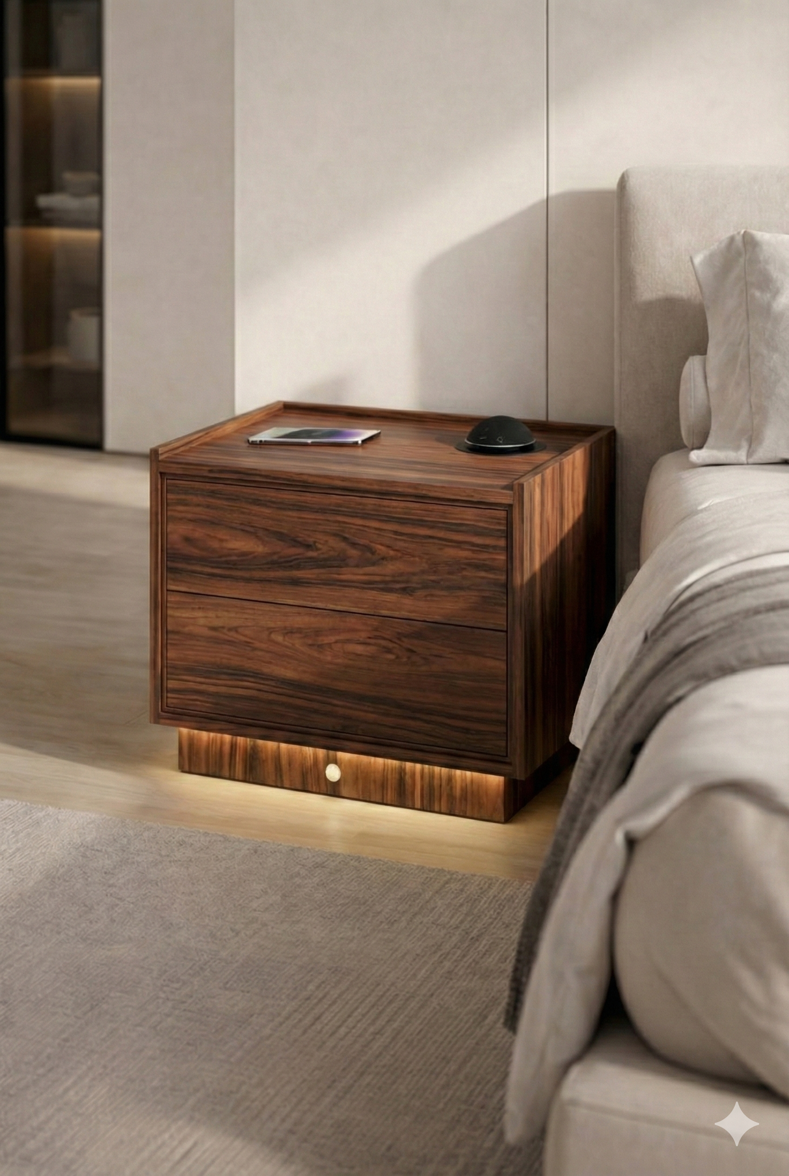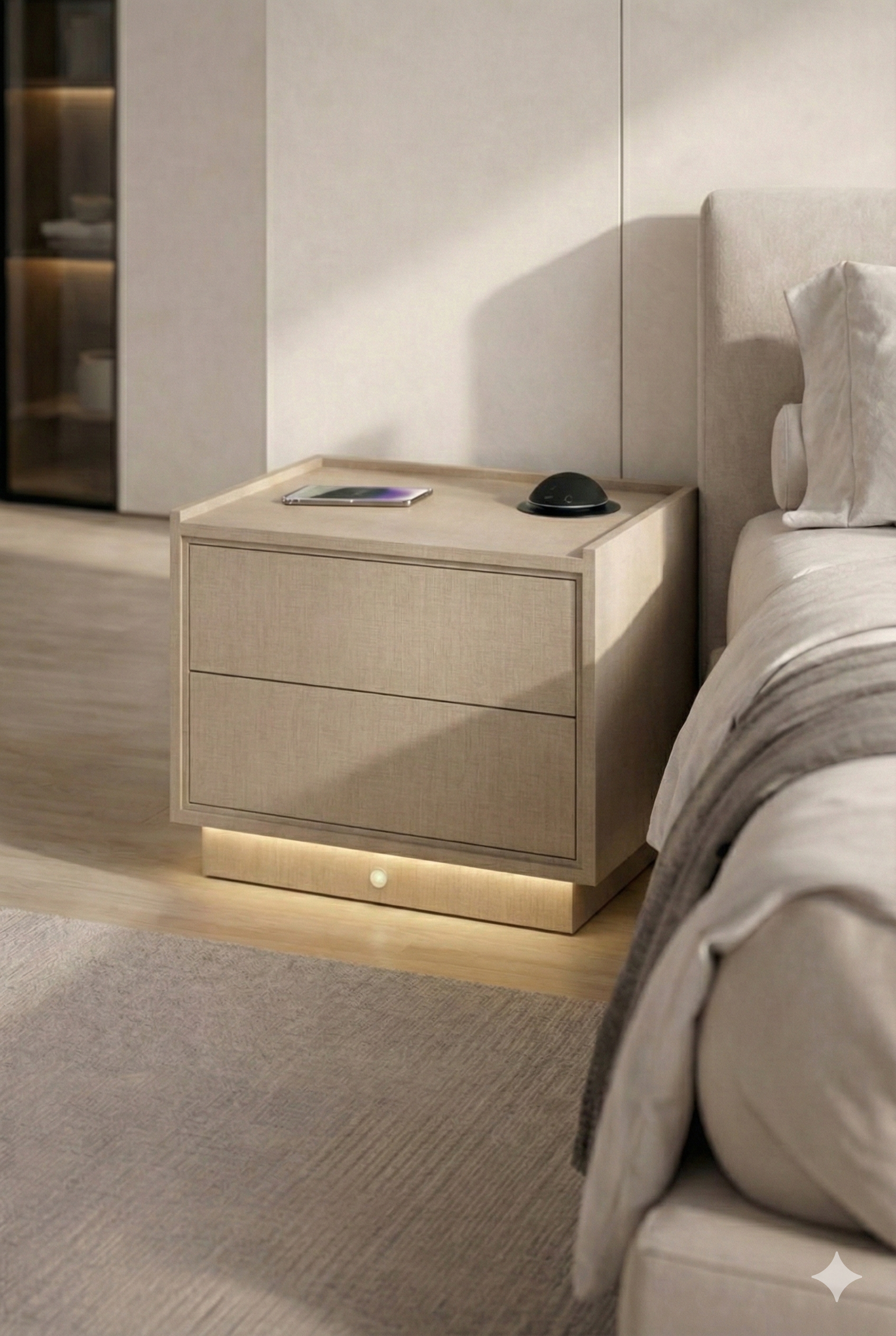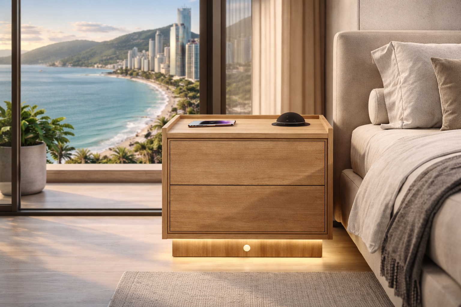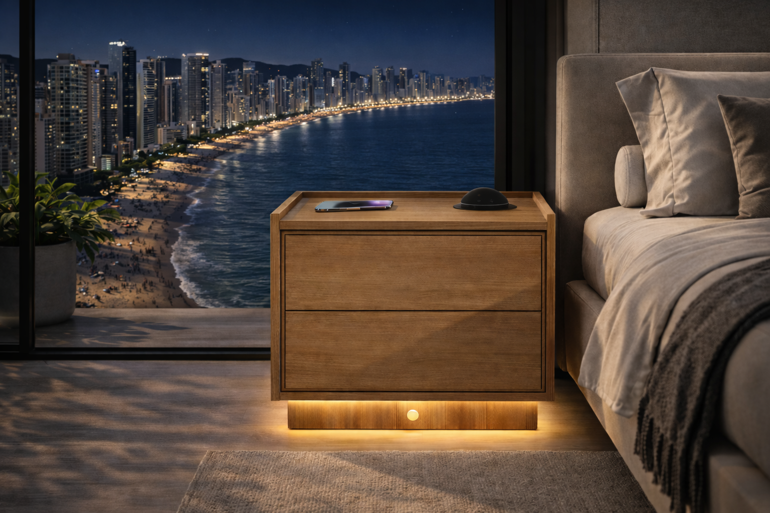Mesa de Cabeceira Inteligente com Iluminação LED e Carregamento por Indução – Alto Padrão Transforme o seu dormitório em uma experiência de conforto, tecnologia e sofisticação. Esta mesa de cabeceira de alto padrão foi projetada para quem busca design moderno, funcionalidade inteligente e acabamento premium. Ideal para dormitórios contemporâneos, apartamentos de luxo e ambientes sofisticados. Diferenciais que fazem a diferença: Design minimalista e elegante, com linhas retas e acabamento em MDF 18mm 2 gavetas amplas, com abertura suave, ideais para organização do dia a dia Iluminação LED embutida no rodapé, que cria um efeito flutuante sofisticado Sensor de presença, acende automaticamente ao se aproximar, perfeito para uso noturno Carregador por indução integrado ao tampo, compatível com smartphones com tecnologia Qi Tampo com bordas elevadas, mais segurança e estética refinada Alexa embutida, incluso junto ao valor do móvel, para que tenha conectividade completa. Tecnologia e conforto: Chega de fios espalhados ou procurar o celular no escuro. A iluminação automática e o carregamento por indução tornam sua rotina mais prática, moderna e segura, sem falar na alexa integrada que torna seu dia a dia muito mais simplificado. Qualidade construtiva: Estrutura robusta e bem acabada Materiais de alto padrão Ideal para quem valoriza durabilidade e estética premium